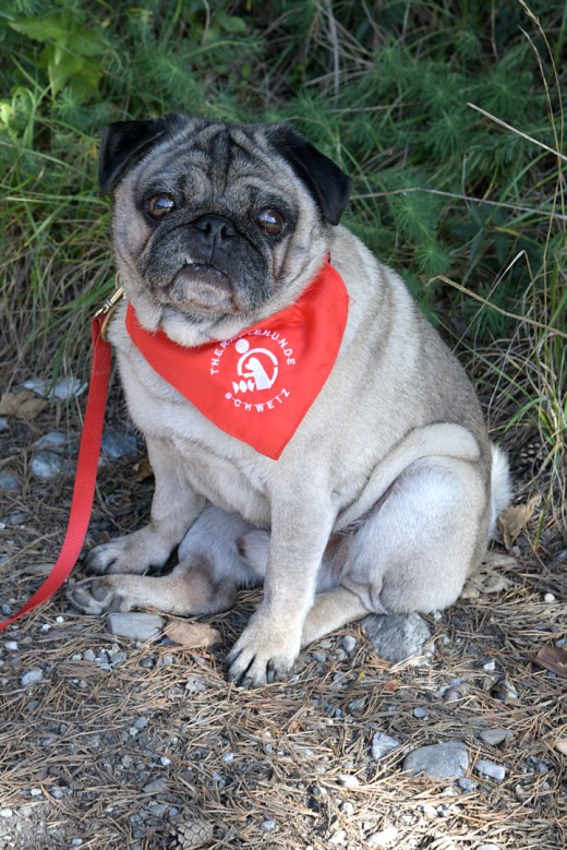 2022 machte ich auch mit meinem Hund Hitsch die Ausbildung zum Schweizerischen Therapiehunde Team. Hitsch ist ein fast 9 Jähriger Mops. Wir dürfen 3x im Monat in verschiedene Alters und Pflegeheime auf Besuch. Hitsch und ich sind ein sehr fröhliches Gespann. Wichtig finde ich, dass auch in der letzten Lebensphase der Humor nicht verloren geht, kann man so vielleicht auch die Trauer, Angst und Einsamkeit ein bisschen leichter nehmen.